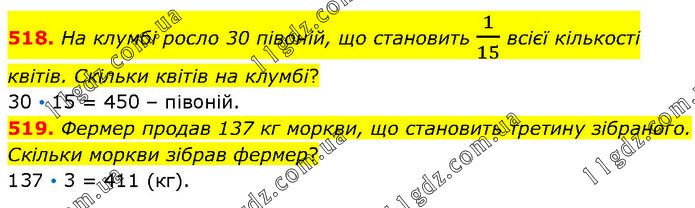 518. На клумбі росло 30 півоній, що становить 1/15 всієї кількості квітів. Скільки квітів на клумбі? 30 • 15 = 450 – півоній. 519. Фермер продав 137 кг моркви, що становить третину зібраного. Скільки моркви зібрав фермер? 137 • 3 = 411 (кг).