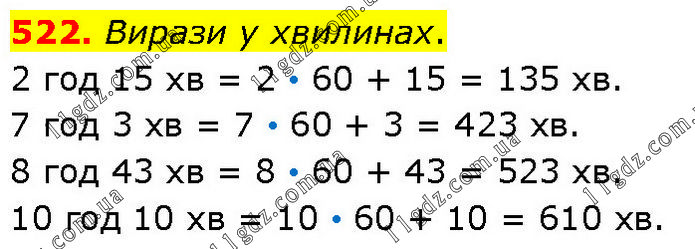 Вирази у хвилинах. 2 год 15 хв = 2 • 60 + 15 = 135 хв. 7 год 3 хв = 7 • 60 + 3 = 423 хв. 8 год 43 хв = 8 • 60 + 43 = 523 хв. 10 год 10 хв = 10 • 60 + 10 = 610 хв.