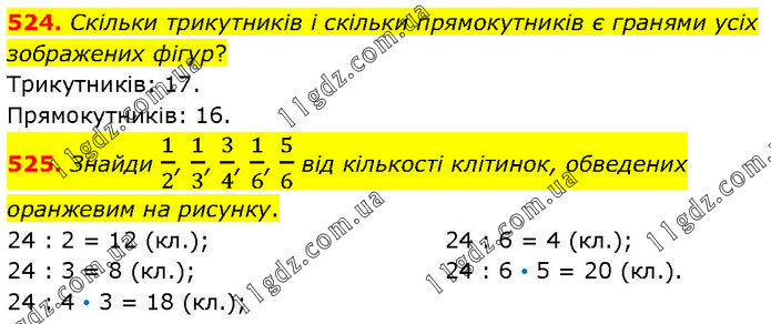 524. Скільки трикутників і скільки прямокутників є гранями усіх зображених фігур? Трикутників: 17. Прямокутників: 16. 525. Знайди 1/2, 1/3, 3/4, 1/6, 5/6 від кількості клітинок, обведених оранжевим на рисунку. 24 : 2 = 12 (кл.); 24 : 3 = 8 (кл.); 24 : 4 • 3 = 18 (кл.); 24 : 6 = 4 (кл.); 24 : 6 • 5 = 20 (кл.).