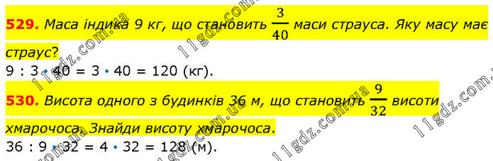 529. Маса індика 9 кг, що становить 3/40 маси страуса. Яку масу має страус? 9 : 3 • 40 = 3 • 40 = 120 (кг). 530. Висота одного з будинків 36 м, що становить 9/32 висоти хмарочоса. Знайди висоту хмарочоса. 36 : 9 • 32 = 4 • 32 = 128 (м).