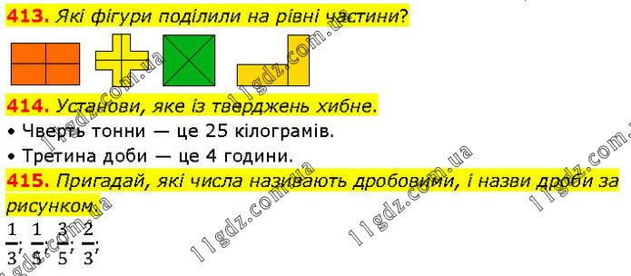 413. Які фігури поділили на рівні частини? 414. Установи, яке із тверджень хибне. • Чверть тонни — це 25 кілограмів. • Третина доби — це 4 години. 415. Пригадай, які числа називають дробовими, і назви дроби за рисунком. 1/3; 1/5; 3/5; 2/3;