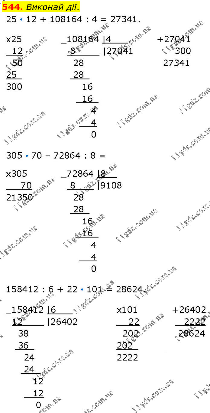 Виконай дії. 25 • 12 + 108164 : 4 = 27341.