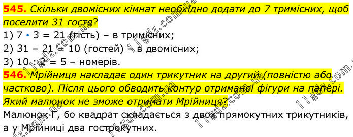 545. Скільки двомісних кімнат необхідно додати до 7 тримісних, щоб поселити 31 гостя? 1) 7 • 3 = 21 (гість) – в тримісних; 2) 31 – 21 = 10 (гостей) – в двомісних; 3) 10 : 2 = 5 – номерів. 546. Мрійниця накладає один трикутник на другий (повністю або частково). Після цього обводить контур отриманої фігури на папері. Який малюнок не зможе отримати Мрійниця? Малюнок Г, бо квадрат складається з двох прямокутних трикутників, а у Мрійниці два гострокутних.