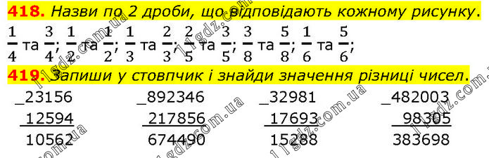 418. Назви по 2 дроби, що відповідають кожному рисунку. 1/4 та 3/4; 1/2 та 1/2; 1/3 та 2/3; 2/5 та 3/5; 3/8 та 5/8; 1/6 та 5/6; 419. Запиши у стовпчик і знайди значення різниці чисел.