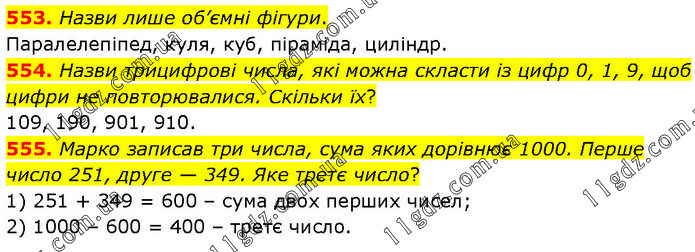 553. Назви лише об’ємні фігури. Паралелепіпед, куля, куб, піраміда, циліндр. 554. Назви трицифрові числа, які можна скласти із цифр 0, 1, 9, щоб цифри не повторювалися. Скільки їх? 109, 190, 901, 910. 555. Марко записав три числа, сума яких дорівнює 1000. Перше число 251, друге — 349. Яке третє число? 1) 251 + 349 = 600 – сума двох перших чисел; 2) 1000 – 600 = 400 – третє число.