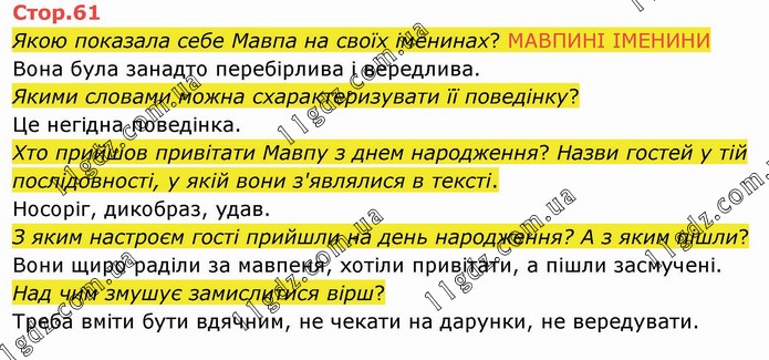 Якою показала себе Мавпа на своїх іменинах? МАВПИНІ ІМЕНИНИ Вона була занадто перебірлива і вередлива. Якими словами можна схарактеризувати її поведінку? Це негідна поведінка. Хто прийшов привітати Мавпу з днем народження? Назви гостей у тій послідовності, у якій вони з'являлися в тексті. Носоріг, дикобраз, удав. З яким настроєм гості прийшли на день народження? А з яким пішли? Вони щиро раділи за мавпеня, хотіли привітати, а пішли засмучені. Над чим змушує замислитися вірш? Треба вміти бути вдячним, не чекати на дарунки, не вередувати.
