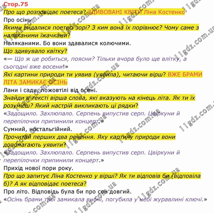 Про що розповідає поетеса? ЗДИВОВАНІ КВІТИ Ліна Костенко Про осінь Якими видалися поетесі зорі? З ким вона їх порівнює? Чому саме з наляканими їжачками? Наляканими. Бо вони здавалися колючими. Що здивувало квітку? «— Що ж це робиться, поясни? Тільки вчора було ще влітку, а сьогодні вже восени!» Які картини природи ти уявив (уявила), читаючи вірш? ВЖЕ БРАМИ ЛІТА ЗАМИКАЄ ОСІНЬ Лани і сади, пожовтілі від осені. Знайди в тексті вірша слова, які вказують на кінець літа. Як ти їх розумієш? Який настрій викликають ці рядки? «Задощило. Захлюпало. Серпень випустив серп. Цвіркуни й перепілочки припинили концерт.» Сумний, ностальгійний. Прочитай перших два речення. Яку картину природи вони допомагають уявити? «Задощило. Захлюпало. Серпень випустив серп. Цвіркуни й перепілочки припинили концерт.» Прихід нової пори року. Про що запитує Ліна Костенко у вірші? Як ти відповів би (відповіла б)? А як відповідає поетеса? Про літо. Відповідь була би про сон довгий. «Осінь брами твої замикала вночі, погубила у небі журавлині ключі.»