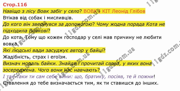 Навіщо з лісу Вовк забіг у село? ВОВК І КІТ Леонід Глібов Втікав від собак і мисливців. До кого він звернувся за допомогою? Чому жодна порада Кота не підходила Вовкові? До кота. Тому що кожен господар у селі мав причину не любити вовка. Які людські вади засуджує автор у байці? Жадібність, страх і егоїзм. Визнач мораль байки. Знайди і прочитай слова, у яких вона зосереджена. Чого вони нас навчають? І так-таки ти сам себе вини: що, братику, посіяв, те й пожни! Ставлення до тебе визначається тим, як ти ставишся до інших.