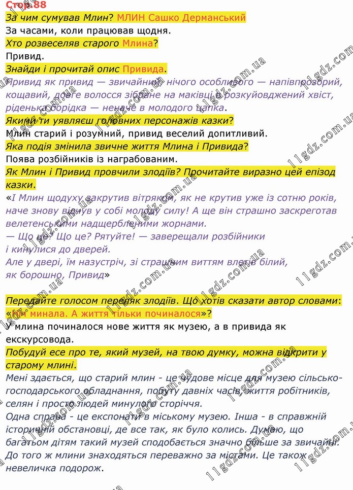 За чим сумував Млин? МЛИН Сашко Дерманський За часами, коли працював щодня. Хто розвеселяв старого Млина? Привид. Знайди і прочитай опис Привида. Привид як привид — звичайний, нічого особливого — напівпрозорий, кощавий, довге волосся зібране на маківці в розкуйовджений хвіст, ріденька борідка — неначе в молодого цапка. Якими ти уявляєш головних персонажів казки? Млин старий і розумний, привид веселий допитливий. Яка подія змінила звичне життя Млина і Привида? Поява розбійників із награбованим. Як Млин і Привид провчили злодіїв? Прочитайте виразно цей епізод казки. «І Млин щодуху закрутив вітряком, як не крутив уже із сотню років, наче знову відчув у собі молоду силу! А ще він страшно заскреготав велетенськими надщербленими жорнами. — Що це? Що це? Рятуйте! — заверещали розбійники і кинулися до дверей. Але у двері, їм назустріч, зі страшним виттям влетів білий, як борошно, Привид» Передайте голосом переляк злодіїв. Що хотів сказати автор словами: «Ніч минала. А життя тільки починалося»? У млина починалося нове життя як музею, а в привида як екскурсовода. Побудуй есе про те, який музей, на твою думку, можна відкрити у старому млині. Мені здається, що старий млин - це чудове місце для музею сільсько-господарського обладнання, побуту давніх часів, життя робітників, селян і просто людей минулого сторіччя. Одна справа - це експонати в міському музею. Інша - в справжній історичній обстановці, де все так, як було колись. Думаю, що багатьом дітям такий музей сподобається значно більше за звичайні. До того ж млини знаходяться переважно за містами. Це також невеличка подорож.