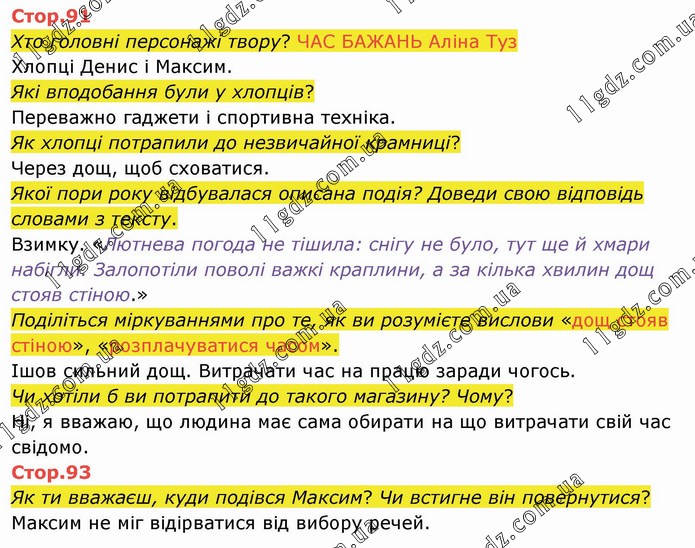 Хто головні персонажі твору? ЧАС БАЖАНЬ Аліна Туз Хлопці Денис і Максим. Які вподобання були у хлопців? Переважно гаджети і спортивна техніка. Як хлопці потрапили до незвичайної крамниці? Через дощ, щоб сховатися. Якої пори року відбувалася описана подія? Доведи свою відповідь словами з тексту. Взимку. «Лютнева погода не тішила: снігу не було, тут ще й хмари набігли. Залопотіли поволі важкі краплини, а за кілька хвилин дощ стояв стіною.» Поділіться міркуваннями про те, як ви розумієте вислови «дощ стояв стіною», «розплачуватися часом». Ішов сильний дощ. Витрачати час на працю заради чогось. Чи хотіли б ви потрапити до такого магазину? Чому? Ні, я вважаю, що людина має сама обирати на що витрачати свій час свідомо. Стор.93 Як ти вважаєш, куди подівся Максим? Чи встигне він повернутися? Максим не міг відірватися від вибору речей.