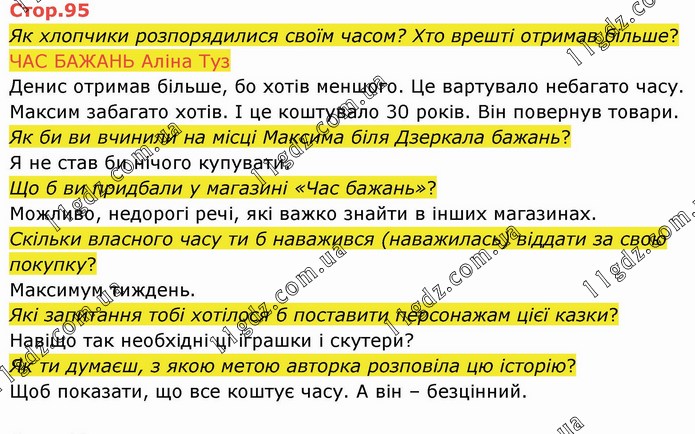 Як хлопчики розпорядилися своїм часом? Хто врешті отримав більше? ЧАС БАЖАНЬ Аліна Туз Денис отримав більше, бо хотів меншого. Це вартувало небагато часу. Максим забагато хотів. І це коштувало 30 років. Він повернув товари. Як би ви вчинили на місці Максима біля Дзеркала бажань? Я не став би нічого купувати. Що б ви придбали у магазині «Час бажань»? Можливо, недорогі речі, які важко знайти в інших магазинах. Скільки власного часу ти б наважився (наважилась) віддати за свою покупку? Максимум тиждень. Які запитання тобі хотілося б поставити персонажам цієї казки? Навіщо так необхідні ці іграшки і скутери? Як ти думаєш, з якою метою авторка розповіла цю історію? Щоб показати, що все коштує часу. А він – безцінний.