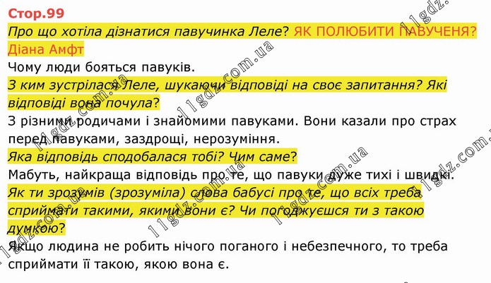 Про що хотіла дізнатися павучинка Леле? ЯК ПОЛЮБИТИ ПАВУЧЕНЯ? Діана Амфт Чому люди бояться павуків. З ким зустрілася Леле, шукаючи відповіді на своє запитання? Які відповіді вона почула? З різними родичами і знайомими павуками. Вони казали про страх перед павуками, заздрощі, нерозуміння. Яка відповідь сподобалася тобі? Чим саме? Мабуть, найкраща відповідь про те, що павуки дуже тихі і швидкі. Як ти зрозумів (зрозуміла) слова бабусі про те, що всіх треба сприймати такими, якими вони є? Чи погоджуєшся ти з такою думкою? Якщо людина не робить нічого поганого і небезпечного, то треба сприймати її такою, якою вона є.