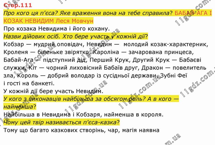 Про кого ця п'єса? Яке враження вона на тебе справила? БАБАЙ-АГА І КОЗАК НЕВИДИМ Леся Мовчун Про козака Невидима і його кохану. Назви дійових осіб. Хто бере участь у кожній дії? Кобзар — мудрий оповідач, Невидим — молодий козак-характерник, Кроленя — біленьке звірятко, Кароліна — зачарована принцеса, Бабай-Ага — підступний дід, Перший Крук, Другий Крук — Бабаєві служки, Кіт — чорний лиховісний Бабаїв друг, Дракон — повелитель зла, Король — добрий володар із сусідньої держави, Зубні Феї і гості на банкеті. У кожній дії бере участь Невидим. У кого з виконавців найбільша за обсягом роль? А в кого — найменша? Найбільша в Невидима і Кобзаря, найменша в короля. Чому цей твір називається п'єса-казка? Тому що багато казкових створінь, чар, магія наявна