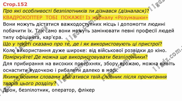 Про які особливості безпілотників ти дізнався (дізналася)? КВАДРОКОПТЕР ТОБІ ПОКАЖЕ! Із журналу «Розумашки» Вони можуть дістатися важкодоступних місць і допомогти людині побачити їх. Так само вони можуть замінювати певні професії людей типу офіціанта, кар'єра. Що у тексті сказано про те, де і як використовують ці пристрої? Коло використання дуже широке: від військової розвідки до кіно. Поміркуйте! Де можна ще використовувати безпілотники? Для прибирання на високих поверхнях, збору врожаю, можна навіть оснастити вудочкою і рибалити далеко в морі. Якими новими словами збагатився твій словник після прочитання творів цього розділу? Дрон, безпілотник, оператор, флікер