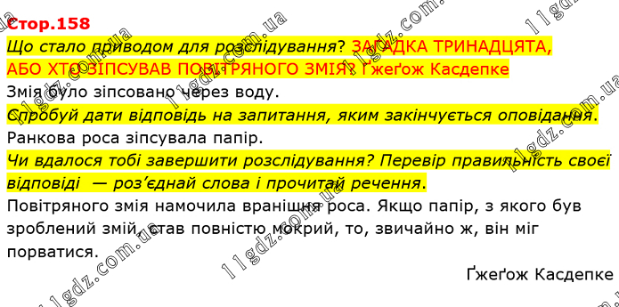 Що стало приводом для розслідування? ЗАГАДКА ТРИНАДЦЯТА, АБО ХТО ЗІПСУВАВ ПОВІТРЯНОГО ЗМІЯ? Ґжеґож Касдепке Змія було зіпсовано через воду. Спробуй дати відповідь на запитання, яким закінчується оповідання. Ранкова роса зіпсувала папір. Чи вдалося тобі завершити розслідування? Перевір правильність своєї відповіді — роз’єднай слова і прочитай речення. Повітряного змія намочила вранішня роса. Якщо папір, з якого був зроблений змій, став повністю мокрий, то, звичайно ж, він міг порватися.
