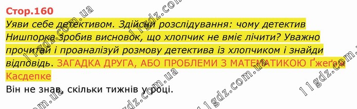 Уяви себе детективом. Здійсни розслідування: чому детектив Нишпорка зробив висновок, що хлопчик не вміє лічити? Уважно прочитай і проаналізуй розмову детектива із хлопчиком і знайди відповідь. ЗАГАДКА ДРУГА, АБО ПРОБЛЕМИ З МАТЕМАТИКОЮ Ґжеґож Касдепке Він не знав, скільки тижнів у році.