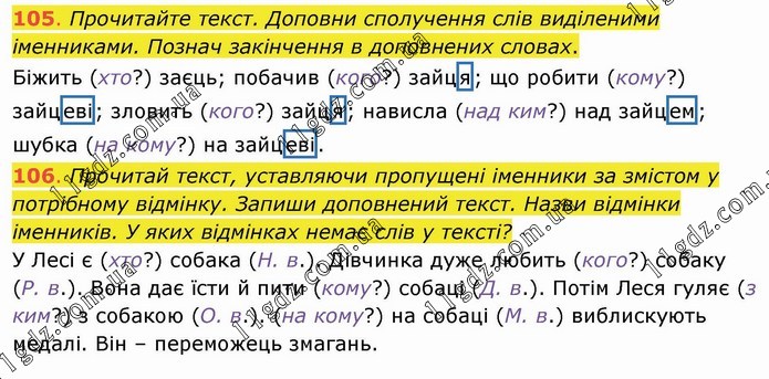 Прочитайте текст. Доповни сполучення слів виділеними іменниками. Познач закінчення в доповнених словах. Біжить (хто?) заєць; побачив (кого?) зайця; що робити (кому?) зайцеві; зловить (кого?) зайця; нависла (над ким?) над зайцем; шубка (на кому?) на зайцеві. 106. Прочитай текст, уставляючи пропущені іменники за змістом у потрібному відмінку. Запиши доповнений текст. Назви відмінки іменників. У яких відмінках немає слів у тексті? У Лесі є (хто?) собака (Н. в.). Дівчинка дуже любить (кого?) собаку (Р. в.). Вона дає їсти й пити (кому?) собаці (Д. в.). Потім Леся гуляє (з ким?) з собакою (О. в.). (на кому?) на собаці (М. в.) виблискують медалі. Він – переможець змагань.