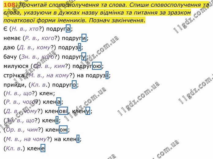 Прочитай словосполучення та слова. Спиши словосполучення та слова, указуючи в дужках назву відмінка та питання за зразком початкової форми іменників. Познач закінчення. Є (Н. в., хто?) подруга; немає (Р. в., кого?) подруги; даю (Д. в., кому?) подрузі; бачу (Зн. в., кого?) подругу; милуюся (Ор. в., ким?) подругою; стрічка (М. в., на кому?) на подрузі; прийди, (Кл. в.) подруго; (Н. в., що?) клен; (Р. в., чого?) клена; (Д. в., чому?) кленові, клену; (Зн. в., що?) клені; (Ор. в., чим?) кленом; (М. в., на чому?) на клені; (Кл. в.) клене