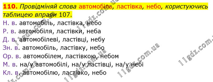 Провідміняй слова автомобіль, ластівка, небо, користуючись таблицею вправи 107. Н. в. автомобіль, ластівка, небо Р. в. автомобіля, ластівки, неба Д. в. автомобілеві, ластівці, небу Зн. в. автомобіль, ластівку, небо Ор. в. автомобілем, ластівкою, небом М. в. на/у автомобілі, на/у ластівці, на/у небі Кл. в. автомобілю, ластівко, небо