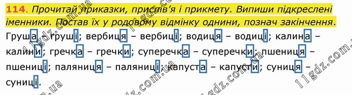 Прочитай приказки, прислів’я і прикмету. Випиши підкреслені іменники. Постав їх у родовому відмінку однини, познач закінчення. Груша – груші; вербиця – вербиці; водиця – водиці; калина – калини; гречка – гречки; суперечка – суперечки; пшениця – пшениці; паляниця – паляниці; капуста – капусти; суниця – суниці.