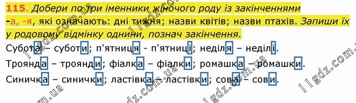 Добери по три іменники жіночого роду із закінченнями -а, -я, які означають: дні тижня; назви квітів; назви птахів. Запиши їх у родовому відмінку однини, познач закінчення. Субота – суботи; п'ятниця - п'ятниці; неділя – неділі. Троянда – троянди; фіалка – фіалки; ромашка – ромашки. Синичка – синички; ластівка – ластівки; сова – сови.