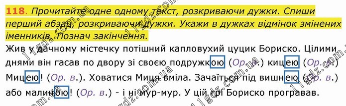 Прочитайте одне одному текст, розкриваючи дужки. Спиши перший абзац, розкриваючи дужки. Укажи в дужках відмінок змінених іменників. Познач закінчення. Жив у дачному містечку потішний капловухий цуцик Бориско. Цілими днями він гасав по двору зі своєю подружкою (Ор. в.) кицею (Ор. в.) Мицею! (Ор. в.). Ховатися Миця вміла. Зачаїться під вишнею (Ор. в.) або малиною! (Ор. в.) - і ні мур-мур. У цій грі Бориско програвав.