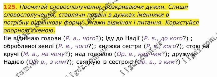 Прочитай словосполучення, розкриваючи дужки. Спиши словосполучення, ставлячи подані в дужках іменники в потрібну відмінкову форму. Укажи відмінок і питання. Користуйся опорною схемою. Не піднімаю голови (Р. в., чого?); іду до Надії (Р. в., до кого?) ; обробленої землі (Р. в., чого?); книжка сестри (Р. в., кого?); стою на кручі (М. в., на чому?); над головою (Ор. в., над чим?); дружу з Надією (Ор. в., з ким?); святкую із сестрою (Ор. в., з ким?)