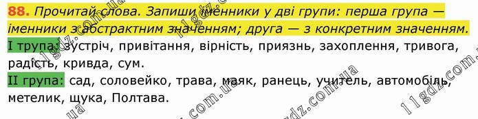 Прочитай слова. Запиши іменники у дві групи: перша група — іменники з абстрактним значенням; друга — з конкретним значенням. І трупа: зустріч, привітання, вірність, приязнь, захоплення, тривога, радість, кривда, сум. ІІ група: сад, соловейко, трава, маяк, ранець, учитель, автомобіль, метелик, щука, Полтава.