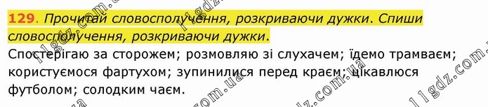 Прочитай словосполучення, розкриваючи дужки. Спиши словосполучення, розкриваючи дужки. Спостерігаю за сторожем; розмовляю зі слухачем; їдемо трамваєм; користуємося фартухом; зупинилися перед краєм; цікавлюся футболом; солодким чаєм.