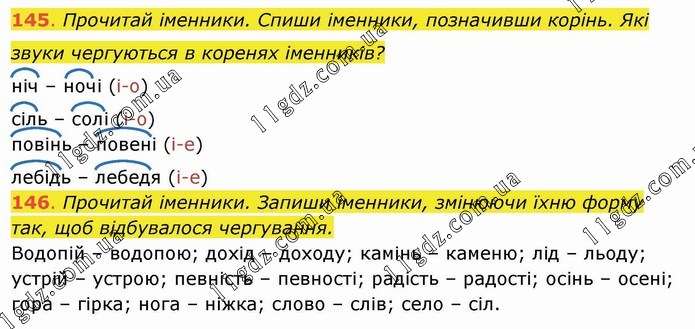 Прочитай іменники. Спиши іменники, позначивши корінь. Які звуки чергуються в коренях іменників? ніч – ночі (і-о) сіль – солі (і-о) повінь – повені (і-е) лебідь – лебедя (і-е) 146. Прочитай іменники. Запиши іменники, змінюючи їхню форму так, щоб відбувалося чергування. Водопій – водопою; дохід – доходу; камінь – каменю; лід – льоду; устрій – устрою; певність – певності; радість – радості; осінь – осені; гора – гірка; нога – ніжка; слово – слів; село – сіл.
