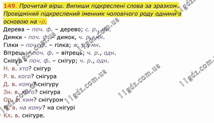 Прочитай вірш. Випиши підкреслені слова за зразком. Провідміняй підкреслений іменник чоловічого роду однини з основою на -р. Дерева – поч. ф. – дерево; с. р., мн. Димки - поч. ф. – димок, ч. р., мн. Гілки – поч. ф. – гілка; ж. р., мн. Вітрець – поч. ф. – вітрець; ч. р., одн. Снігур – поч. ф. – снігур; ч. р., одн. Н. в. хто? снігур Р. в. кого? снігура Д. в. кому? снігуру Зн. в. кого? снігура Ор. в. ким? снігуром М. в. на кому? на снігурі Кл. в. снігуре.