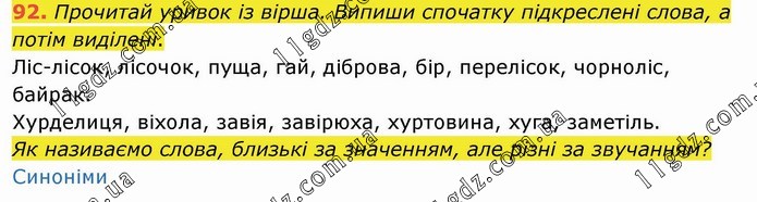 Прочитай уривок із вірша. Випиши спочатку підкреслені слова, а потім виділені. Ліс-лісок, лісочок, пуща, гай, діброва, бір, перелісок, чорноліс, байрак. Хурделиця, віхола, завія, завірюха, хуртовина, хуга, заметіль. Як називаємо слова, близькі за значенням, але різні за звучанням? Синоніми