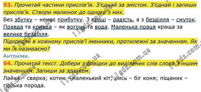 Прочитай частини прислів’їв. З’єднай за змістом. З’єднай і запиши прислів’я. Створи малюнок до одного з них. Без збутку – немає прибутку. З праці – радість, а з безділля – смуток. Правда та кривда – як вогонь та вода. Маленька праця краща за велике безділля. Підкресли в кожному прислів’ї іменники, протилежні за значенням. Як ми їх називаємо? Антоніми. 94. Прочитай текст. Добери з довідки до виділених слів слова з іншим значенням. Запиши за зразком. Лайка – сварка; котик – маленький кіт; рись – біг коня; піщаник – гірська порода.