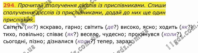 Прочитай сполучення дієслів із прислівниками. Спиши сполучення дієслів із прислівниками, додай до них ще один прислівник. Світить (як?) яскраво, гарно; світить (де?) високо, ясно; ходить (як?) тихо, повільно; співає (як?) весело, чудесно; прокинувся (коли?) сьогодні, пізно; дізналися (коли?) тепер, зараз.