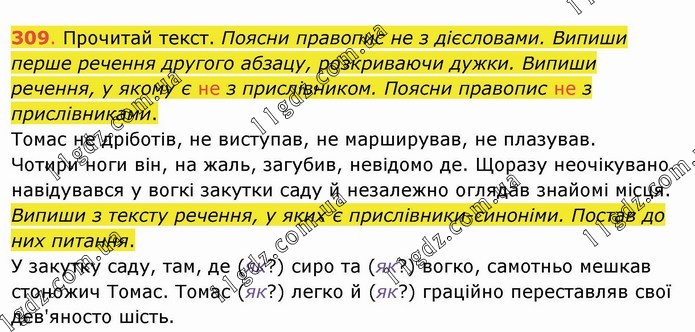 Прочитай текст. Поясни правопис не з дієсловами. Випиши перше речення другого абзацу, розкриваючи дужки. Випиши речення, у якому є не з прислівником. Поясни правопис не з прислівниками. Томас не дріботів, не виступав, не марширував, не плазував. Чотири ноги він, на жаль, загубив, невідомо де. Щоразу неочікувано навідувався у вогкі закутки саду й незалежно оглядав знайомі місця. Випиши з тексту речення, у яких є прислівники-синоніми. Постав до них питання. У закутку саду, там, де (як?) сиро та (як?) вогко, самотньо мешкав стоножич Томас. Томас (як?) легко й (як?) граційно переставляв свої дев'яносто шість.