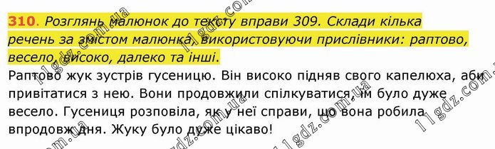 Розглянь малюнок до тексту вправи 309. Склади кілька речень за змістом малюнка, використовуючи прислівники: раптово, весело, високо, далеко та інші. Раптово жук зустрів гусеницю. Він високо підняв свого капелюха, аби привітатися з нею. Вони продовжили спілкуватися, їм було дуже весело. Гусениця розповіла, як у неї справи, що вона робила впродовж дня. Жуку було дуже цікаво!