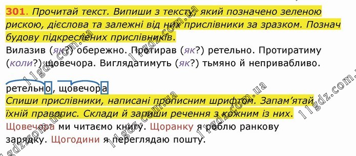 Прочитай текст. Випиши з тексту, який позначено зеленою рискою, дієслова та залежні від них прислівники за зразком. Познач будову підкреслених прислівників. Вилазив (як?) обережно. Протирав (як?) ретельно. Протиратиму (коли?) щовечора. Виглядатимуть (як?) тьмяно й непривабливо. ретельно, щовечора Спиши прислівники, написані прописним шрифтом. Запам’ятай їхній правопис. Склади й запиши речення з кожним із них. Щовечора ми читаємо книгу. Щоранку я роблю ранкову зарядку. Щогодини я переглядаю пошту.