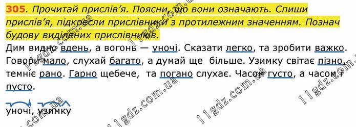 Прочитай прислів’я. Поясни, що вони означають. Спиши прислів’я, підкресли прислівники з протилежним значенням. Познач будову виділених прислівників. Дим видно вдень, а вогонь — уночі. Сказати легко, та зробити важко. Говори мало, слухай багато, а думай ще більше. Узимку світає пізно, темніє рано. Гарно щебече, та погано слухає. Часом густо, а часом і пусто. уночі, узимку