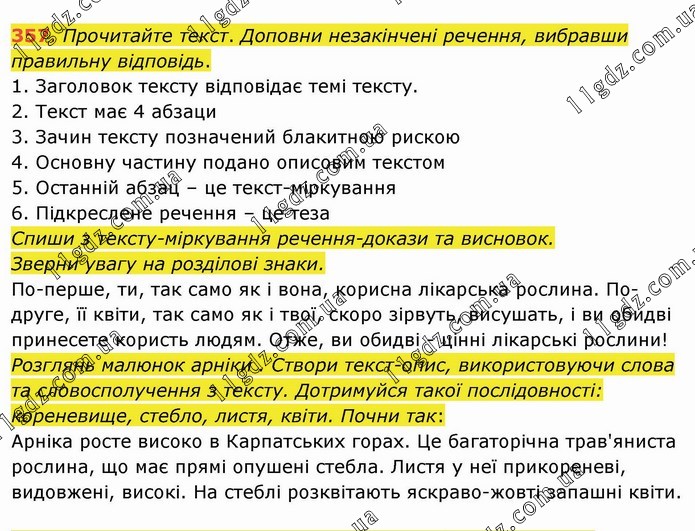 Прочитайте текст. Доповни незакінчені речення, вибравши правильну відповідь. 1. Заголовок тексту відповідає темі тексту. 2. Текст має 4 абзаци 3. Зачин тексту позначений блакитною рискою 4. Основну частину подано описовим текстом 5. Останній абзац – це текст-міркування 6. Підкреслене речення – це теза Спиши з тексту-міркування речення-докази та висновок. Зверни увагу на розділові знаки. По-перше, ти, так само як і вона, корисна лікарська рослина. По-друге, її квіти, так само як і твої, скоро зірвуть, висушать, і ви обидві принесете користь людям. Отже, ви обидві - цінні лікарські рослини! Розглянь малюнок арніки . Створи текст-опис, використовуючи слова та словосполучення з тексту. Дотримуйся такої послідовності: кореневище, стебло, листя, квіти. Почни так: Арніка росте високо в Карпатських горах. Це багаторічна трав'яниста рослина, що має прямі опушені стебла. Листя у неї прикореневі, видовжені, високі. На стеблі розквітають яскраво-жовті запашні квіти.