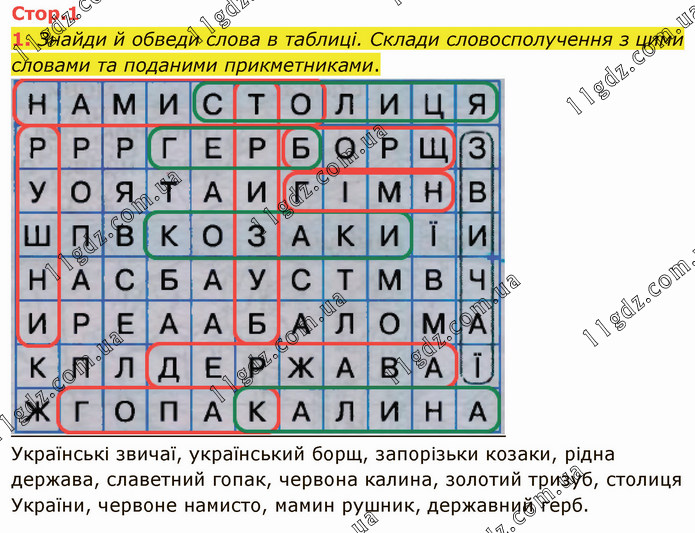 Знайди й обведи слова в таблиці. Склади словосполучення з цими словами та поданими прикметниками. Українські звичаї, український борщ, запорізьки козаки, рідна держава, славетний гопак, червона калина, золотий тризуб, столиця України, червоне намисто, мамин рушник, державний герб.