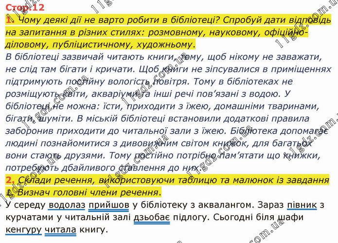 Чому деякі дії не варто робити в бібліотеці? Спробуй дати відповідь на запитання в різних стилях: розмовному, науковому, офіційно-діловому, публіцистичному, художньому. В бібліотеці зазвичай читають книги, тому, щоб нікому не заважати, не слід там бігати і кричати. Щоб книги не зіпсувалися в приміщеннях підтримують постійну вологість повітря. Тому в бібліотеках не розміщують квіти, акваріуми та інші речі пов’язані з водою. У бібліотеці не можна: їсти, приходити з їжею, домашніми тваринами, бігати, шуміти. В міській бібліотеці встановили додаткові правила заборонив приходити до читальної зали з їжею. Бібліотека допомагає людині познайомитися з дивовижним світом книжок, для багатьох вони стають друзями. Тому постійно потрібно пам’ятати що книжки, потребують дбайливого ставлення до них. 2. Склади речення, використовуючи таблицю та малюнок із завдання 1. Визнач головні члени речення. У середу водолаз прийшов у бібліотеку з аквалангом. Зараз півник з курчатами у читальній залі дзьобає підлогу. Сьогодні біля шафи кенгуру читала книгу.