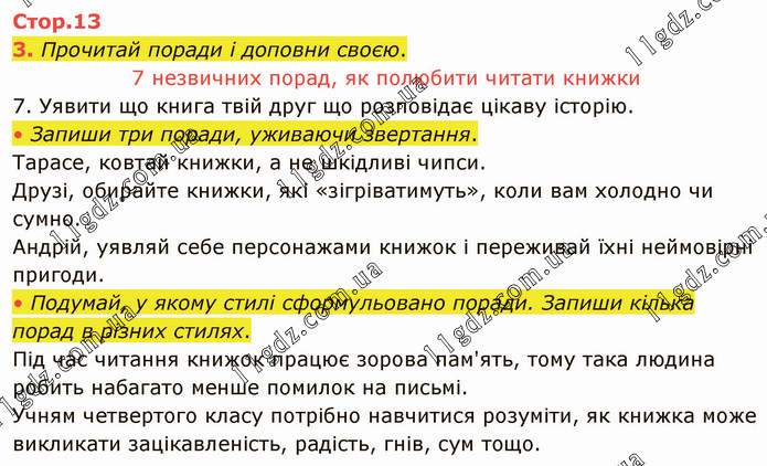 Прочитай поради і доповни своєю. 7 незвичних порад, як полюбити читати книжки 7. Уявити що книга твій друг що розповідає цікаву історію. • Запиши три поради, уживаючи звертання. Тарасе, ковтай книжки, а не шкідливі чипси. Друзі, обирайте книжки, які «зігріватимуть», коли вам холодно чи сумно. Андрій, уявляй себе персонажами книжок і переживай їхні неймовірні пригоди. • Подумай, у якому стилі сформульовано поради. Запиши кілька порад в різних стилях. Під час читання книжок працює зорова пам'ять, тому така людина робить набагато менше помилок на письмі. Учням четвертого класу потрібно навчитися розуміти, як книжка може викликати зацікавленість, радість, гнів, сум тощо.