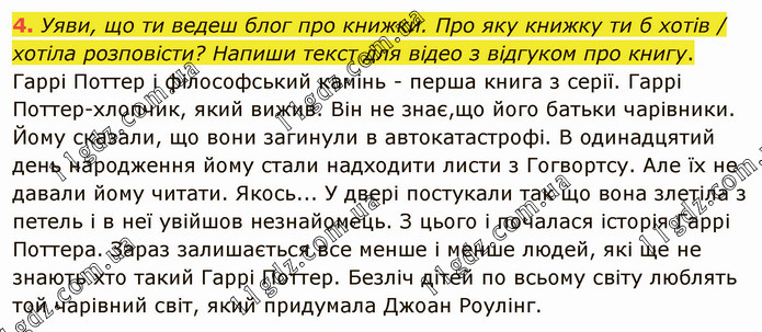 Уяви, що ти ведеш блог про книжки. Про яку книжку ти б хотів / хотіла розповісти? Напиши текст для відео з відгуком про книгу. Гаррі Поттер і філософський камінь - перша книга з серії. Гаррі Поттер-хлопчик, який вижив. Він не знає,що його батьки чарівники. Йому сказали, що вони загинули в автокатастрофі. В одинадцятий день народження йому стали надходити листи з Гогвортсу. Але їх не давали йому читати. Якось... У двері постукали так що вона злетіла з петель і в неї увійшов незнайомець. З цього і почалася історія Гаррі Поттера. Зараз залишається все менше і менше людей, які ще не знають хто такий Гаррі Поттер. Безліч дітей по всьому світу люблять той чарівний світ, який придумала Джоан Роулінг.