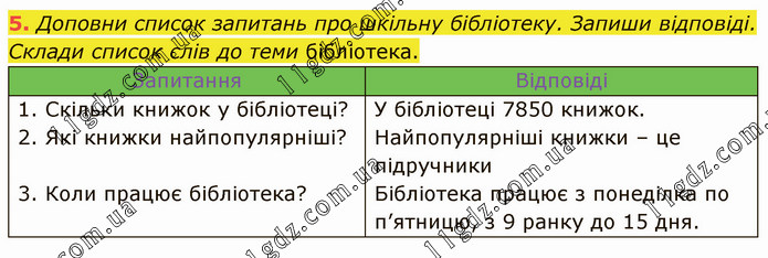 Доповни список запитань про шкільну бібліотеку. Запиши відповіді. Склади список слів до теми бібліотека. Запитання Відповіді 1. Скільки книжок у бібліотеці? 2. Які книжки найпопулярніші? 3. Коли працює бібліотека? У бібліотеці 7850 книжок. Найпопулярніші книжки – це підручники Бібліотека працює з понеділка по п’ятницю, з 9 ранку до 15 дня.