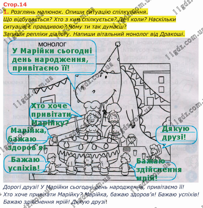 Розглянь малюнок. Опиши ситуацію спілкування. Що відбувається? Хто з ким спілкується? Де і коли? Наскільки ситуація є правдивою? Чому ти так думаєш? Запиши репліки діалогу. Напиши вітальний монолог від Дракоші. Дорогі друзі! У Марійки сьогодні день народження, привітаємо її! Хто хоче привітати Марійку? Марійка, бажаю здоров’я! Бажаю успіхів! Бажаю здійснення мрій! Дякую друзі!