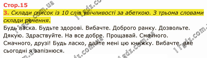 Склади список із 10 слів увічливості за абеткою. З трьома словами склади речення. Будь ласка. Будьте здорові. Вибачте. Доброго ранку. Дозвольте. Дякую. Здраствуйте. На все добре. Прощавай. Смачного. Смачного, друзі! Будь ласко, дайте мені цю книжку. Вибачте, але сьогодні я запізнюся.