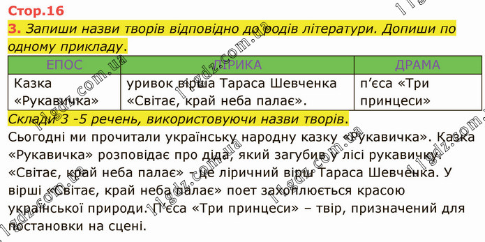Запиши назви творів відповідно до родів літератури. Допиши по одному прикладу. ЕПОС ЛІРИКА ДРАМА Казка «Рукавичка» уривок вірша Тараса Шевченка «Світає, край неба палає». п’єса «Три принцеси» Склади 3 -5 речень, використовуючи назви творів. Сьогодні ми прочитали українську народну казку «Рукавичка». Казка «Рукавичка» розповідає про діда, який загубив у лісі рукавичку. «Світає, край неба палає» - це ліричний вірш Тараса Шевченка. У вірші «Світає, край неба палає» поет захоплюється красою української природи. П’єса «Три принцеси» – твір, призначений для постановки на сцені.