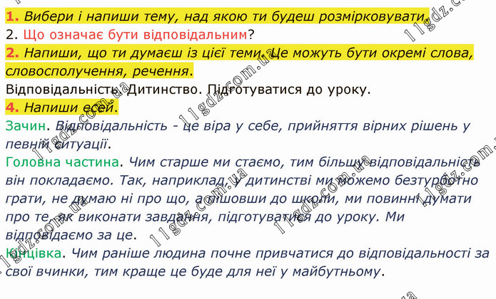 Вибери і напиши тему, над якою ти будеш розмірковувати. 2. Що означає бути відповідальним? 2. Напиши, що ти думаєш із цієї теми. Це можуть бути окремі слова, словосполучення, речення. Відповідальність. Дитинство. Підготуватися до уроку. 4. Напиши есей. Зачин. Відповідальність - це віра у себе, прийняття вірних рішень у певній ситуації. Головна частина. Чим старше ми стаємо, тим більшу відповідальність він покладаємо. Так, наприклад, у дитинстві ми можемо безтурботно грати, не думаю ні про що, а пішовши до школи, ми повинні думати про те, як виконати завдання, підготуватися до уроку. Ми відповідаємо за це. Кінцівка. Чим раніше людина почне привчатися до відповідальності за свої вчинки, тим краще це буде для неї у майбутньому.