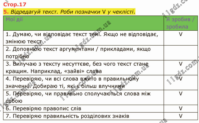 Відредагуй текст. Роби позначки V у чеклісті. Мої дії Я зробив / зробила 1. Думаю, чи відповідає текст темі. Якщо не відповідає, змінюю текст V 2. Доповнюю текст аргументами / прикладами, якщо потрібно 3. Вилучаю з тексту несуттєве, без чого текст стане кращим. Наприклад, «зайві» слова V 4. Перевіряю, чи всі слова вжито в правильному значенні. Добираю ті, які є більш влучними V 5. Перевіряю, чи правильно сполучаються слова між собою V 6. Перевіряю правопис слів V 7. Перевіряю правильність розділових знаків V