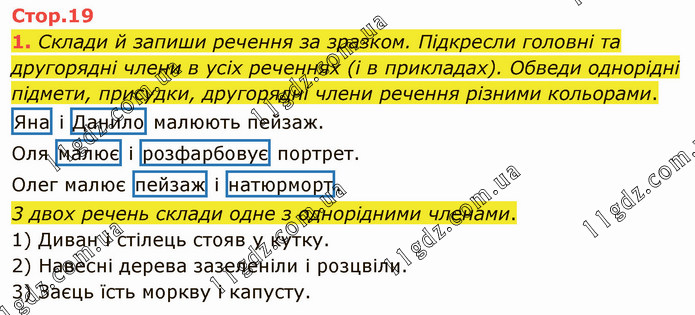 Склади й запиши речення за зразком. Підкресли головні та другорядні члени в усіх реченнях (і в прикладах). Обведи однорідні підмети, присудки, другорядні члени речення різними кольорами. Яна і Данило малюють пейзаж. Оля малює і розфарбовує портрет. Олег малює пейзаж і натюрморт. 3 двох речень склади одне з однорідними членами. 1) Диван і стілець стояв у кутку. 2) Навесні дерева зазеленіли і розцвіли. 3) Заєць їсть моркву і капусту.